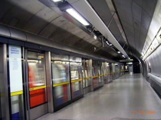 左は地下鉄ジュビリー線から乗り場までの道順に設けられた