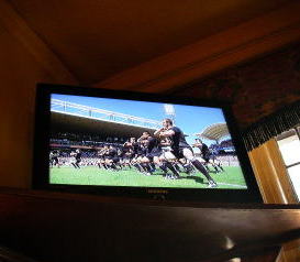 | パブに設置されたTVでこの日リヨンにて12時から始まろうとしている おなじみのニュージーランド・オールブラックスのハカ |